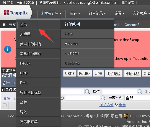 1.【未发货订单】->【全部】,打开订单列表页面