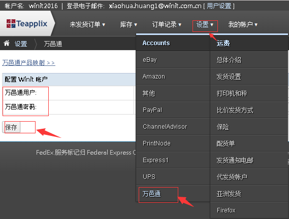2.在【设置】菜单下面进入【万邑通】, 输入万邑联用户名和密码,点击【保存】。