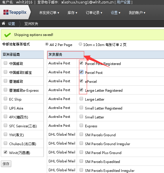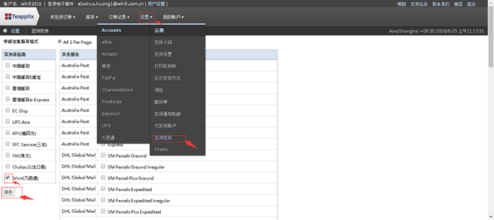 1.登陆Teapplix系统,【设置】->【亚洲发货】, 勾选左侧【Winit(万邑通)】, 此时右侧页面会刷新出万邑通支持的发货方式,勾选所需使用的派送服务,点击【保存】。
