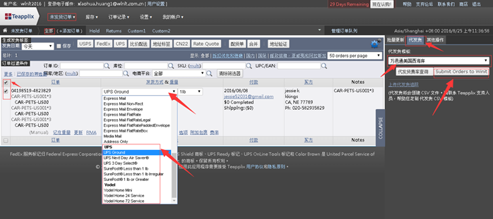 2.选择一到多个未发货订单, 点选万邑通支持的【发货方式】, 然后, 在页面右边点开【代发货】标签页, 选择相应的【万邑通仓库】, 然后点击按钮【推送订单Submit Orders to Winit】,如果推送成功, 订单就会标记发货。