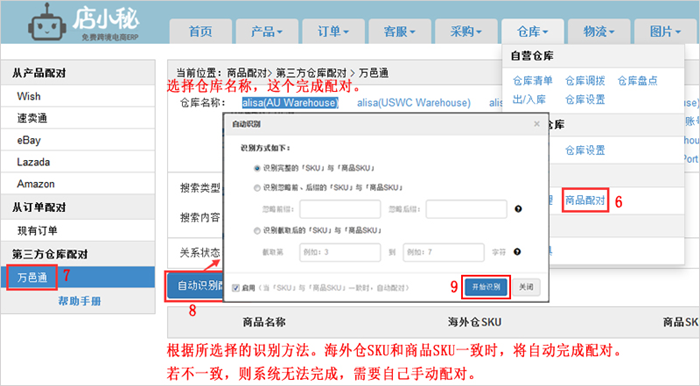成功同步库存后,进入【商品配对】-【第三方仓库配对】-【万邑通】页面,即可看到已同步到的海外仓SKU。需要和店小秘【商品管理】中已创建好的商品SKU完成配对。根据配对关系,订单发货时才可以实现自动扣海外仓的库存。配对方法如下图: