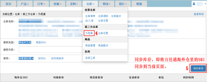 授权成功后,进入【第三方仓库】-【万邑通】,选中所授权开启的仓库并【同步库存】,即可将万邑通海外仓中的SKU同步到店小秘。如下图: