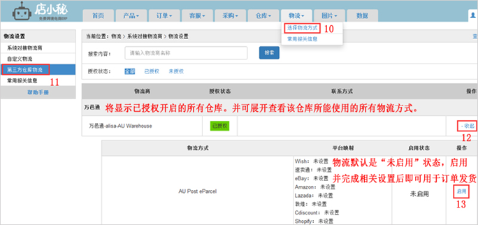 进入【物流】-【系统对接物流】-【第三方仓库物流】页,即可看到已授权开启的所有仓库,并可【展开】查看该仓库所支持的物流方式。【启用】并完成该物流的相关设置,即可使用该物流完成订单的发货。如下图: