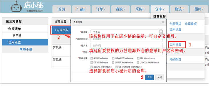 进入【仓库】-【第三方仓库】-【仓库设置】,即可添加万邑通的授权。如下图: