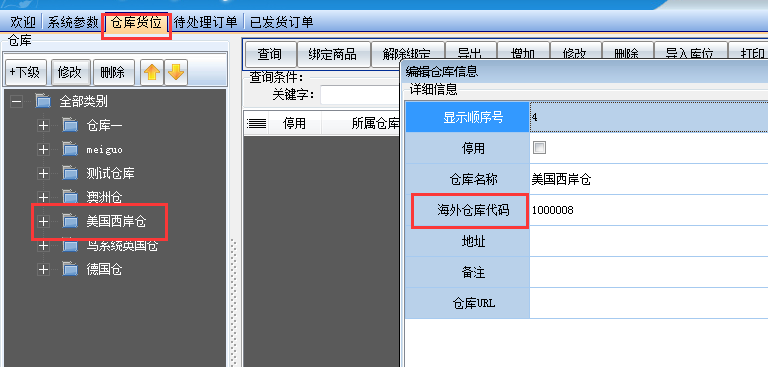 如果已经创建了万邑通海外仓,在左边的数据中找到对应万邑通海外仓;如果没有,则请先创建万邑通海外仓,如下图所示(此处,海外仓库代码对应仓库ID)
