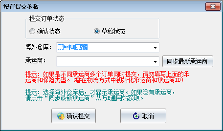 ③:点击上图中所示【万邑通提交订单(s)】会弹出一个万邑通设置提交参数窗口,客户可以通过选择不同的提交订单状态,来改变订单提交到后台之后是草稿或者确认状态,在海外仓库选项中选择在仓库货位中已创建的海外仓,然后可以通过右边的同步最新承运商来更新系统中,当前海外仓下所有的可用承运商,之后确认提交,就完成了订单提交