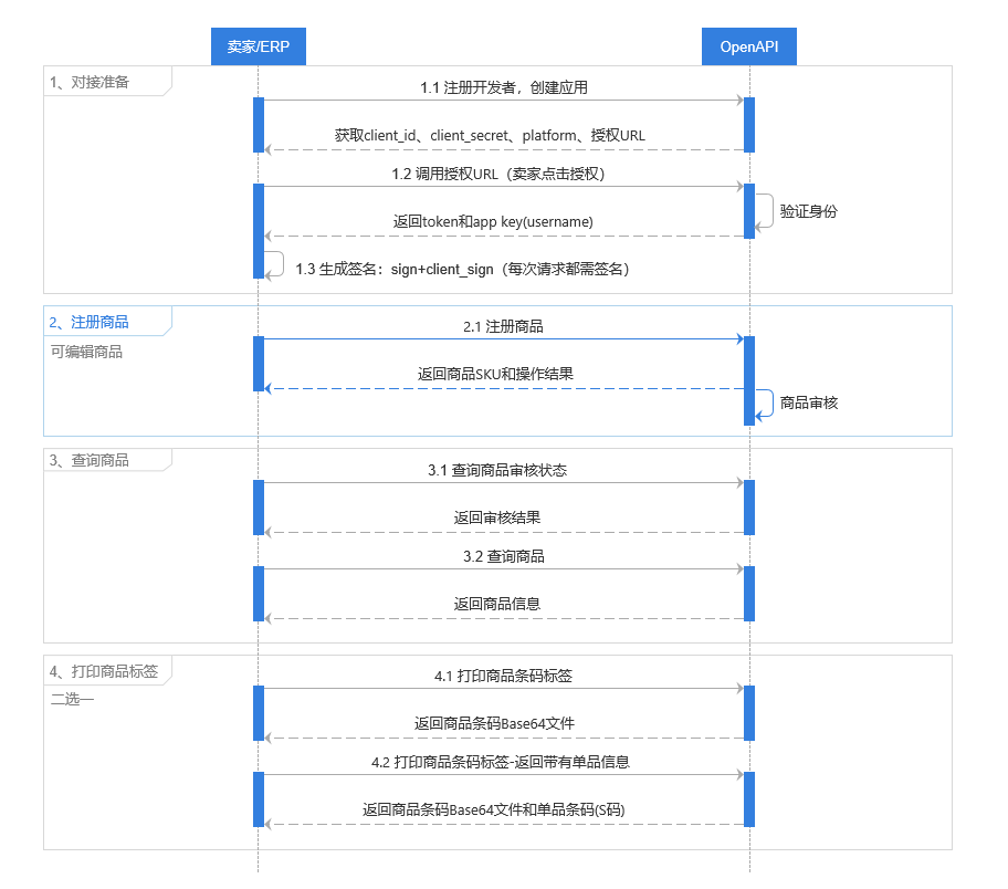 | 单品化管理 | 否 | 1. 注册/编辑商品 2. 打印商品条码标签-返回单品条码信息 3. 查询商品的单品条码及其状态 |
