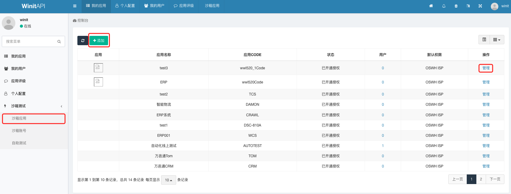 登录开发者平台,进入沙箱测试-沙箱应用菜单。创建沙箱应用请参照创建开放应用(正式)