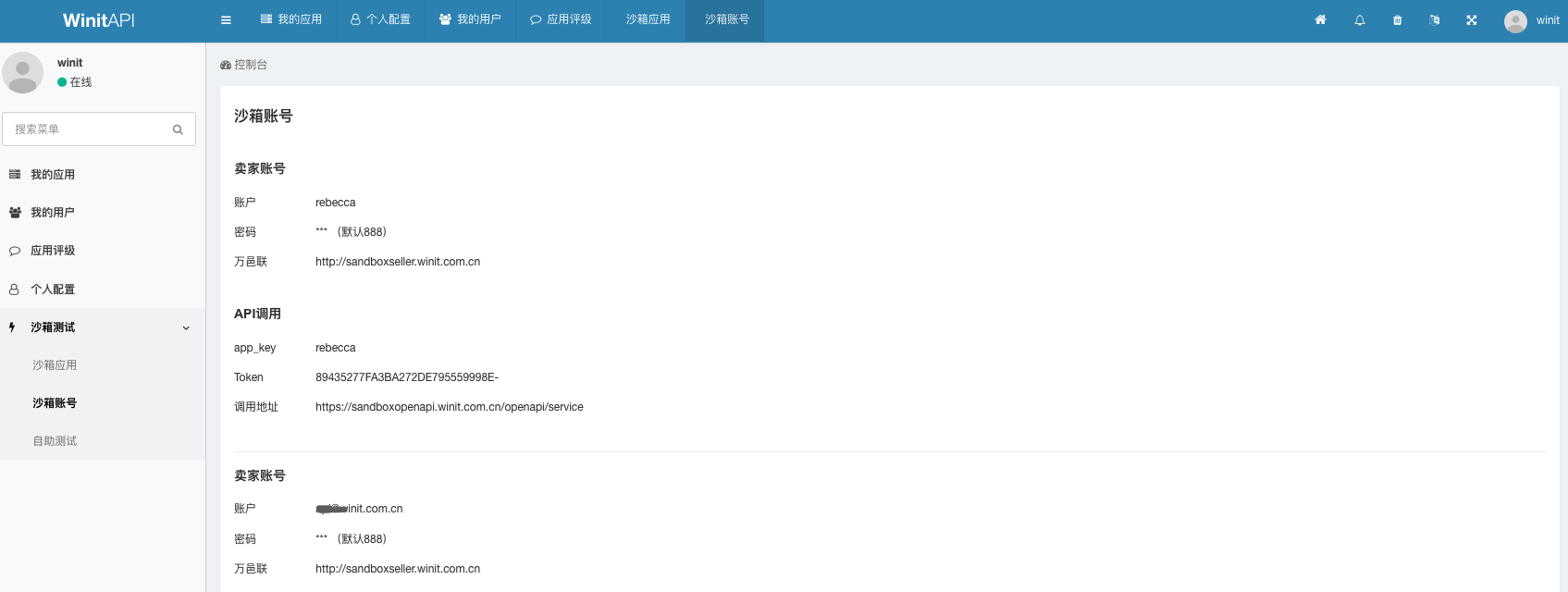 | 万邑联(卖家网站) | http://sandboxseller.winit.com.cn/ 帐户、密码详见开放平台 |