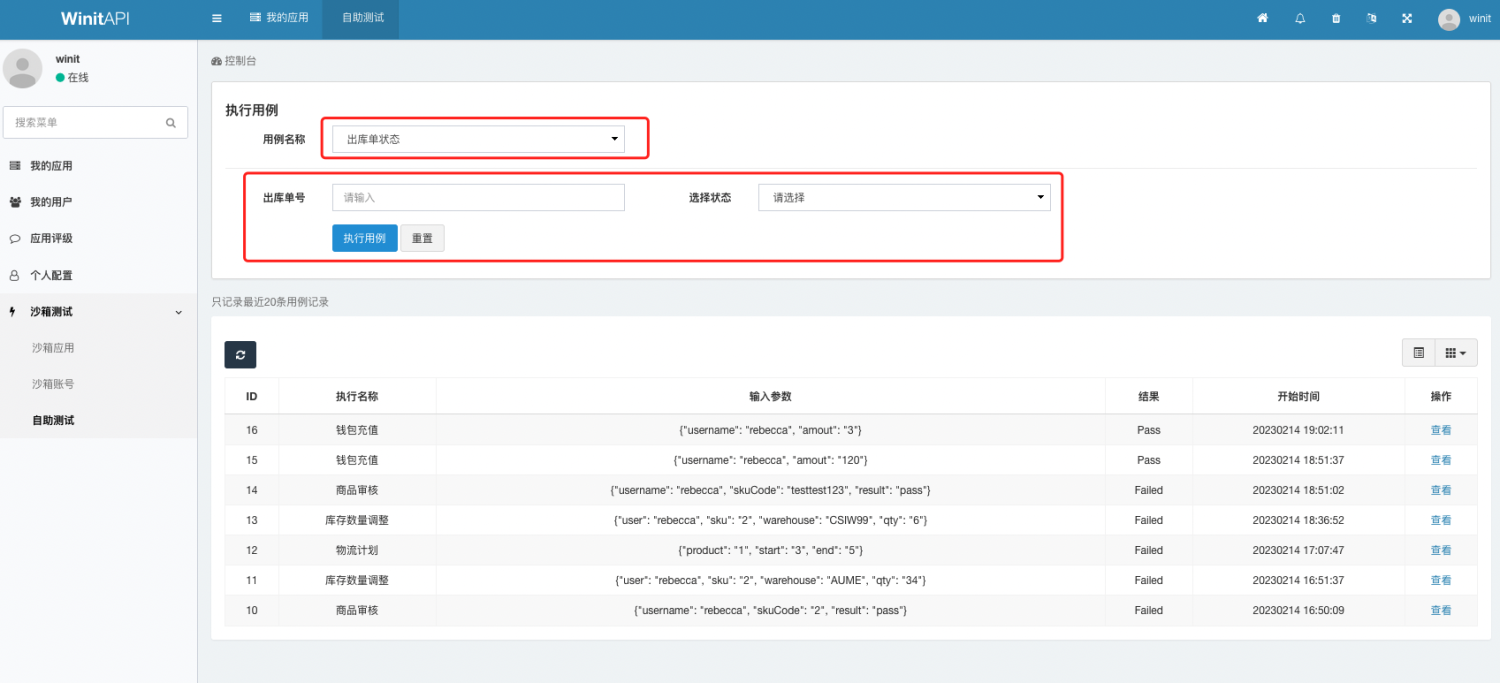 进入自助测试菜单,选择相应需要测试的用例,并输入想要测试的结果即可