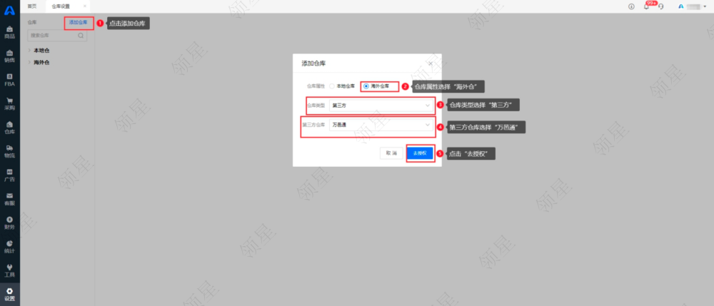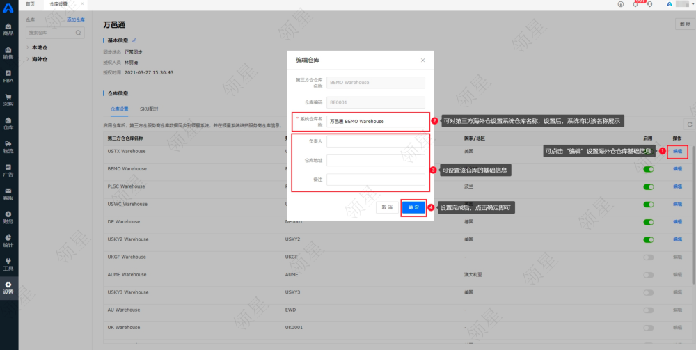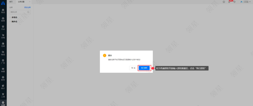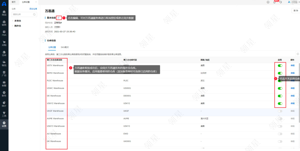 万邑通授权成功后,会自动同步万邑通海外仓仓库数据和 SKU 数据。