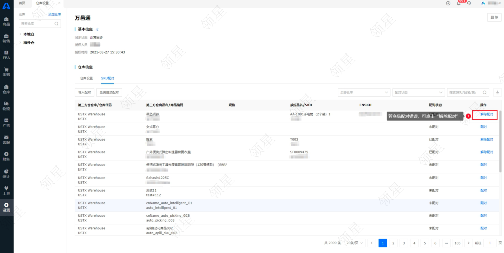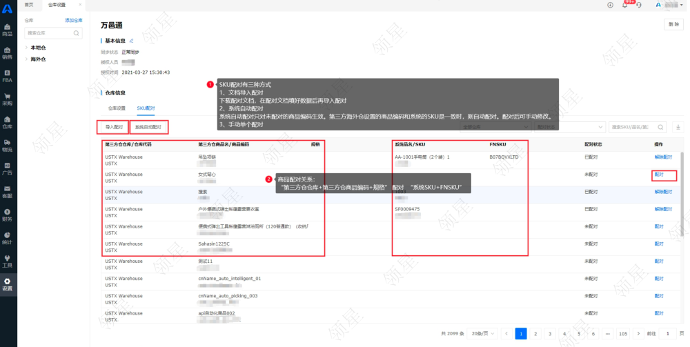 仓库设置成功后,需把系统 SKU 和已授权的第三方海外仓系统的商品进行配对。商品配