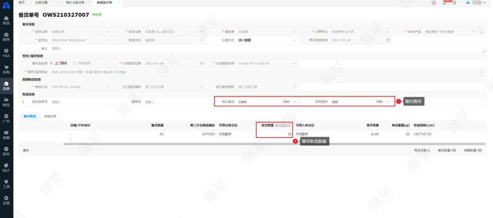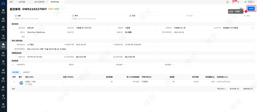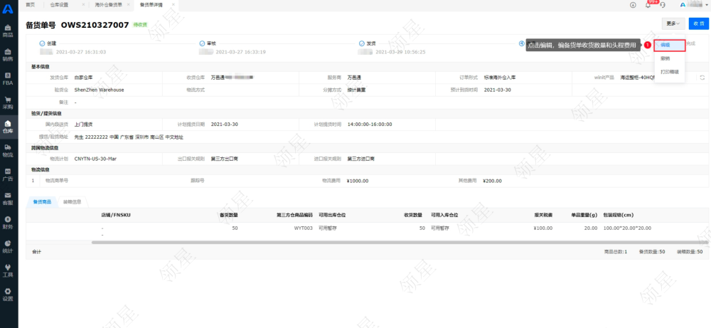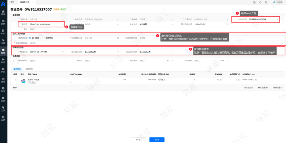 注意:备货单申报成功后,必填信息不可修改。如要修改单据,需到万邑通后台进行操作。