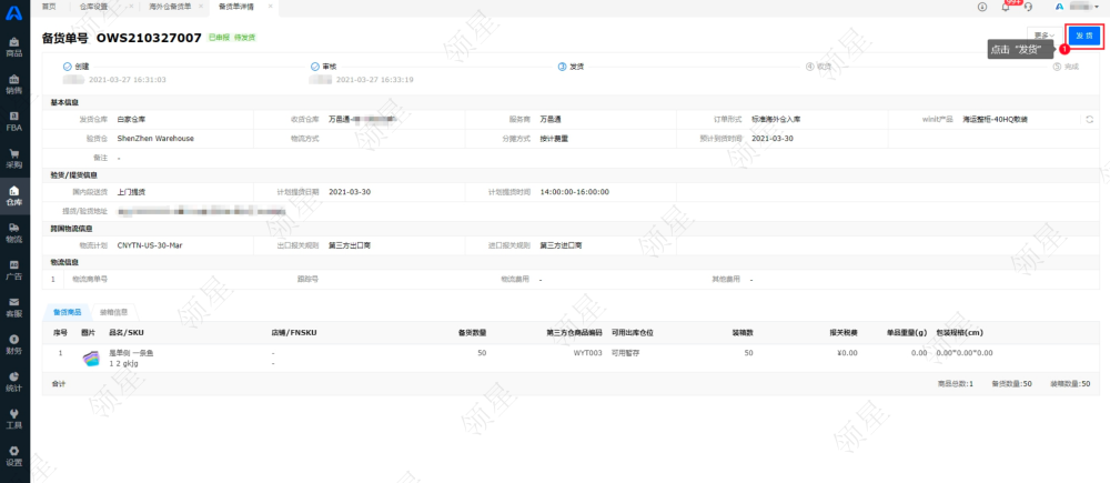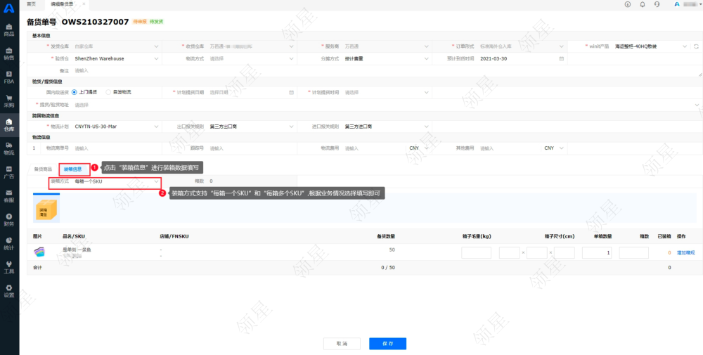 创建单据,审核成功后,在待发货状态需要填写验货仓和验货方式数据,以及装箱数据。