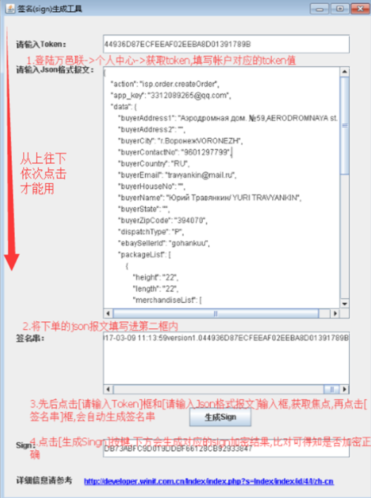 步骤3:运行工具 先输入【Token】和【json格式报文】,见下图中的示例;工具将自动生成【签名串】,点击【生成sign】将获取签名串密码结果。