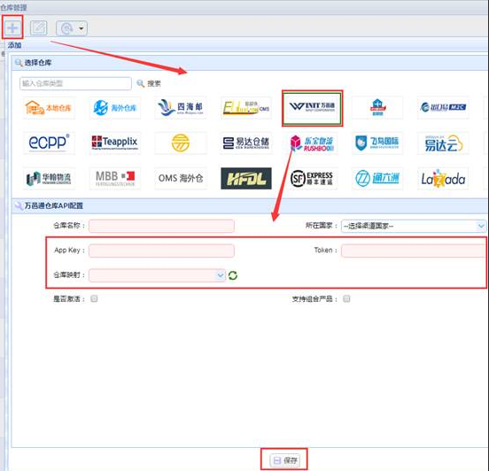 2、登录成功后,在系统管理->系统设置->仓库管理,添加仓库,填写App Key和token进行授权,填写无误,仓库映射会通过授权的接口同步进系统,填写完后,保存。