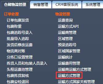 5、仓库添加完成后,需设置海外仓运输方式,路径:仓储物流管理->物流管理->运输方式管理