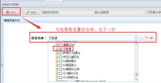 进入运输方式管理页面,点击添加,先选择仓库,然后点下一步,在弹出的编辑运输方式页面,选择海外仓运输方式,(仓库授权后,海外仓运输方式会自动同步进系统)选择需要使用的方式。保存。