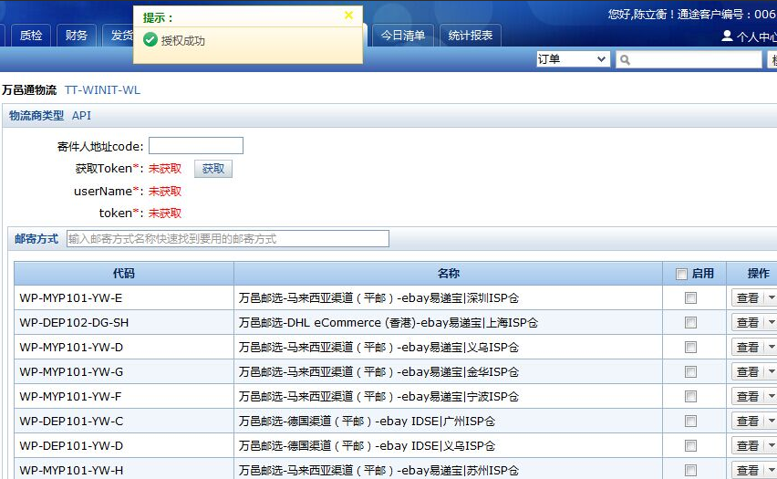 注:如果授权是出现以下情形的界面,需要停用再启用一次物流“万邑通物流”