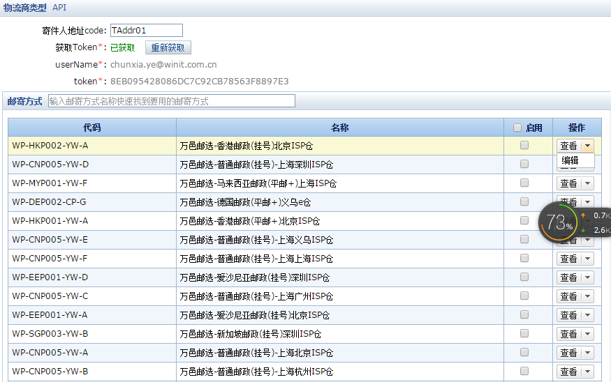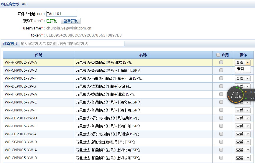 七、最后在回到刚才的万邑通物流配置页面,针对右下方显示的万邑通物流提供的所有邮寄方式,勾选【启用】。