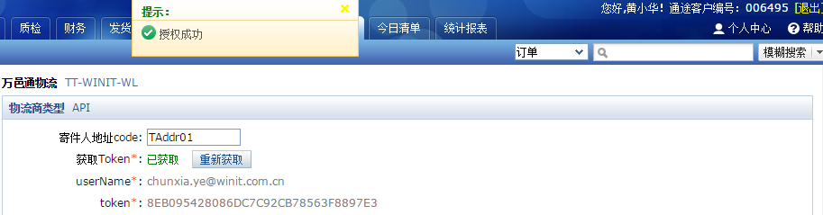 五、点击“获取“按钮,输入万邑联帐户和密码以及地址code,点击确认,系统提示授权成功,接着点击页面右下角【保存】。