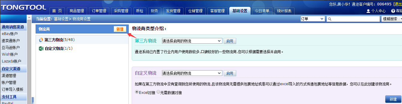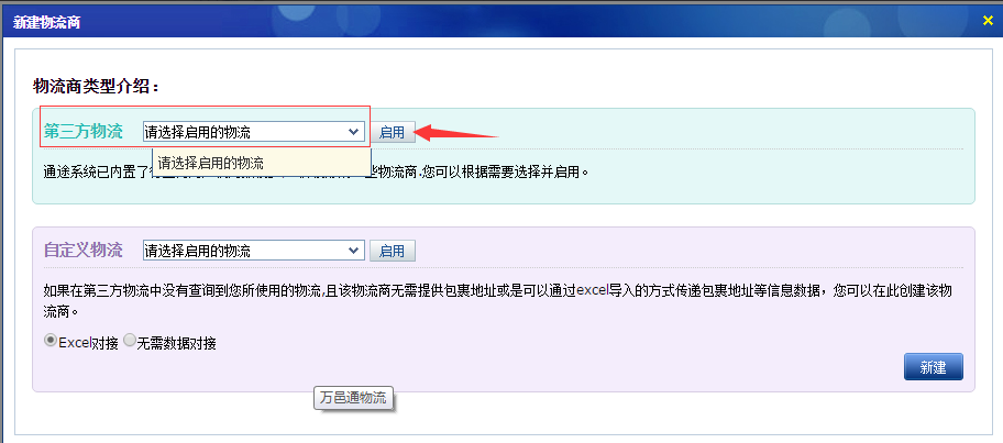三、 在物流设置页面左侧物流商中点击按钮”新建”,弹出新建物流商界面,点击第三方物流选项,下拉选择”万邑通物流“,然后点击”启用“ ,此时系统提示启用成功。