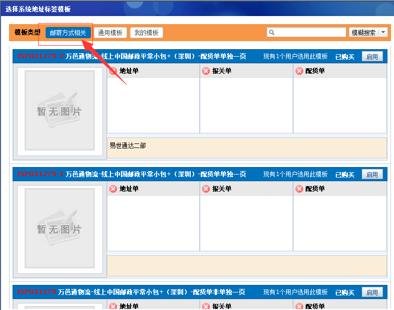 6.3 【标签机模板】:点击选择打印模板,弹出模板筛选窗口,点击【邮寄方式相关】,列表会自动选出可用这个物流方式的面单模板,点击【启用】设定模板;最后点击【保存】完成配置。