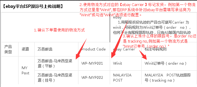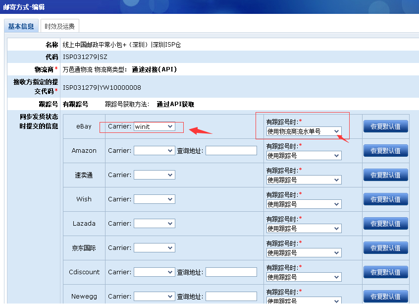 注意:【同步发货状态时提交的信息】->ebay: 指订单发货后,标记到销售平台(ebay)上的承运商名称,请访问链接:《ebay平台ISP跟踪号上传说明》后进行填写。