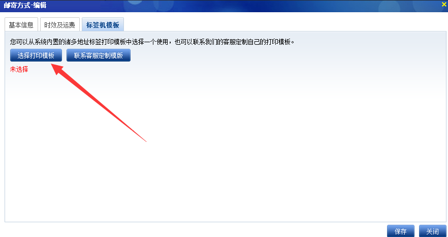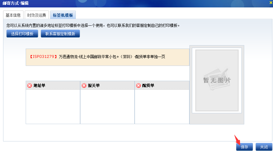 6.2.【时效及运费】按提供给您的价卡进行配置,因这块的设置仅影响分配物流的规则,不做详细介绍,点击【保存】后会显示【标签机模板】配置页面