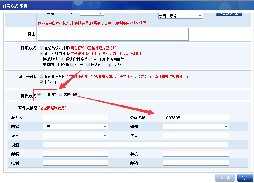 您可在此窗口配置邮寄方式的“基本信息、时效及运费、标签机模板”,