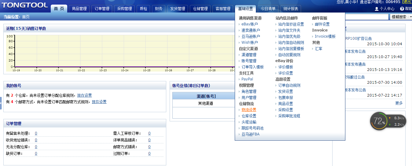 二、进入系统中”基础设置->仓储物流->物流设置“,进入物流设置页面。