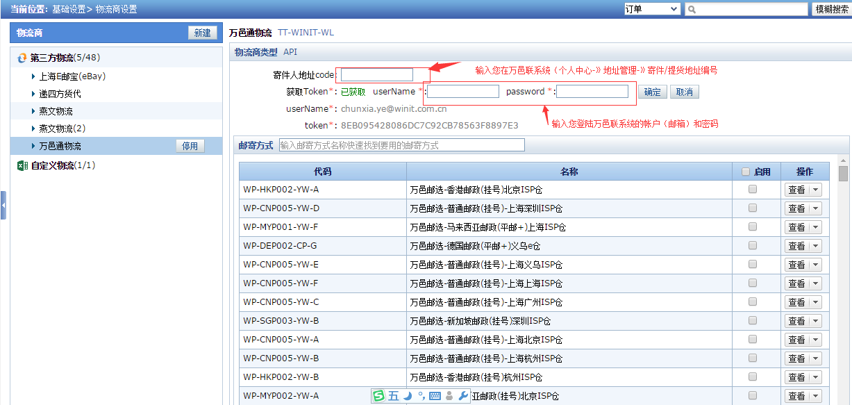 四、点击左侧物流商中”万邑通物流“,右侧出现万邑通物流配置页面。