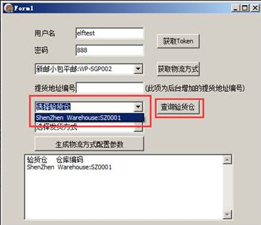 2:选择一个物流方式,点击查询验货仓库,可以得到这个物流方式的验货仓库列表。