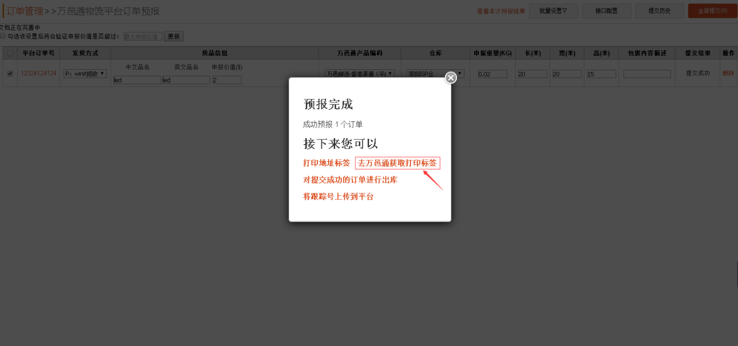 勾选需提交的订单,点击【全部提交】,显示以下提交结果页面: