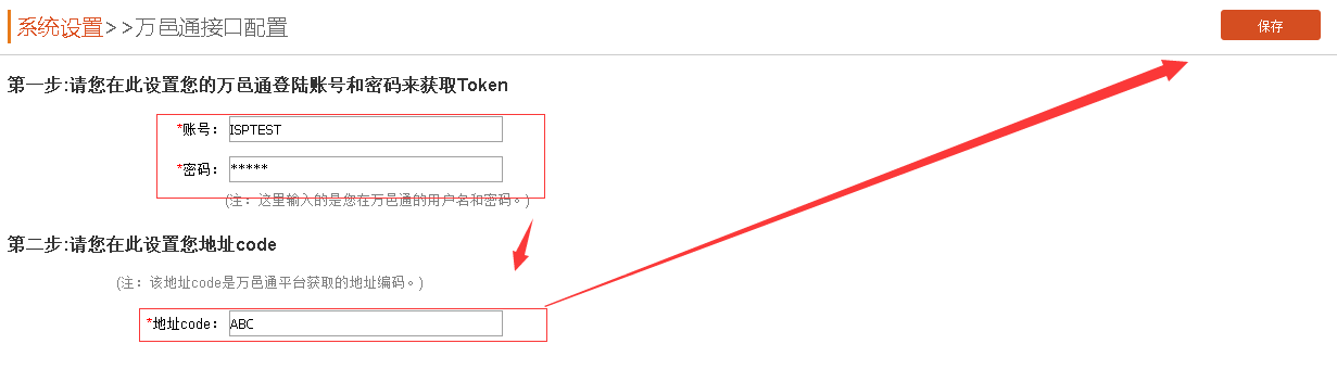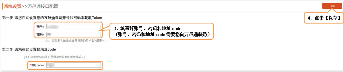 二、进入万邑通接口设置页面,填写如下授权信息,最后点击【保存】。