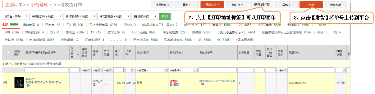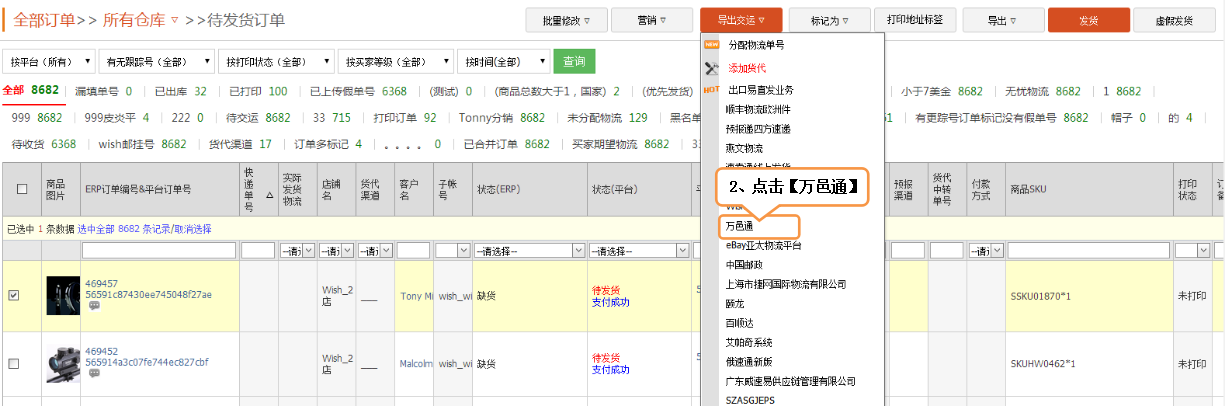 点击【发货】-》【待发货订单】,已经审核通过的订单会在此页面显示。勾选需要提交的订单,然后点击【导出交运】-》【万邑通】。