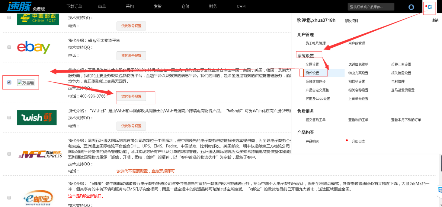 一、登陆速脉ERP,[设置]-》【系统设置】-》【货代设置】,在物流商列表勾选【万邑通】,之后点击右上角【保存】,再接着点击【货代帐户设置】配置授权信息。