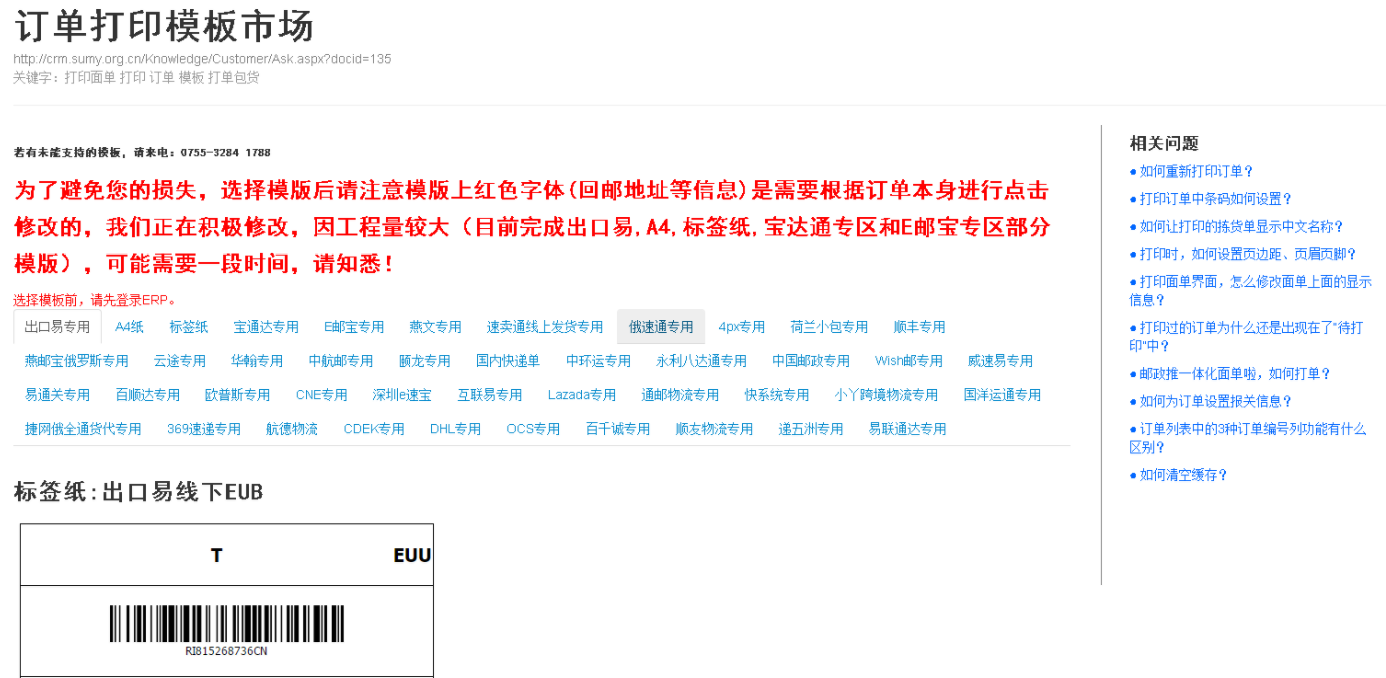 【打印地址标签】是指使用速脉 ERP中【订单打印模板市场】的面单模板打印,这个需要速脉ERP已经提供了正确的模板情况进行操作,且首次发货时需将打印出的面单交给销售经理进行核对,未提供模板的情形下,请使用【去万邑通获取打印标签】的方式。