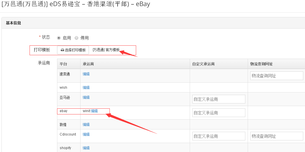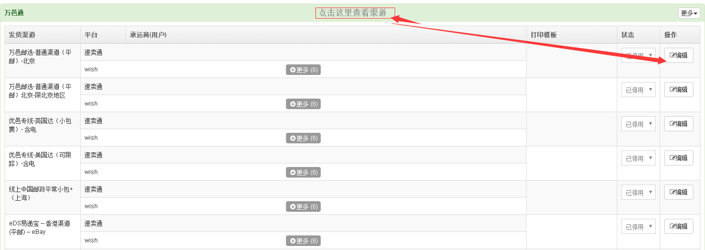 4.启用发货渠道,点击【万邑通】打开渠道列表,选择需启用的发货渠道,点击【编辑】