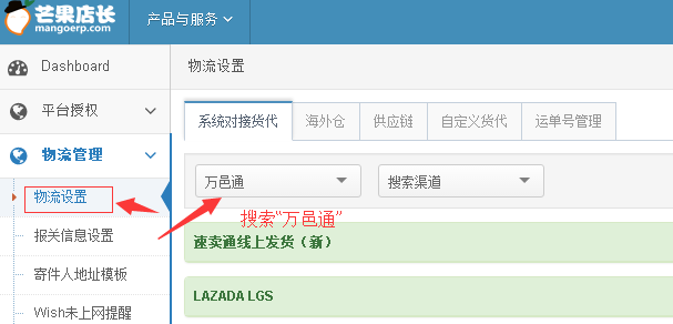 2.点击【物流管理】-》【物流设置】,在右侧页面中搜索“万邑通”,搜索到后点击最右侧【更多】选择【编辑授权】