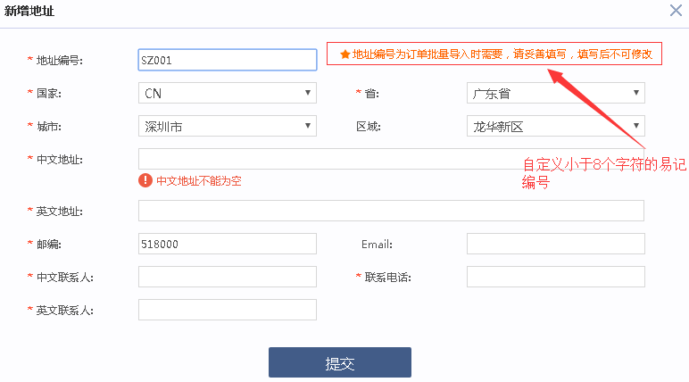 注:【编号】是自定义填写的小于8个字符的易使用的编码,且地址提交后要1个工作日进行审核
