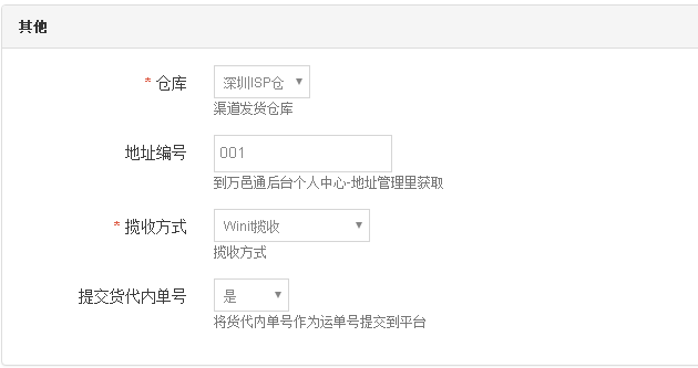 【仓库】:使用前置准备中的 step3创建的【寄件/揽收地址】创建的地址审核的仓库选择;