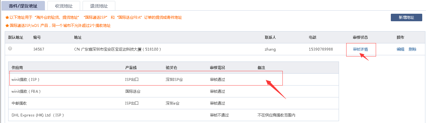 Step3:审核完后,点击【审核详情】可查看审核情况,确认可以使用的国内ISP验货仓库和可使用的发货方式。
