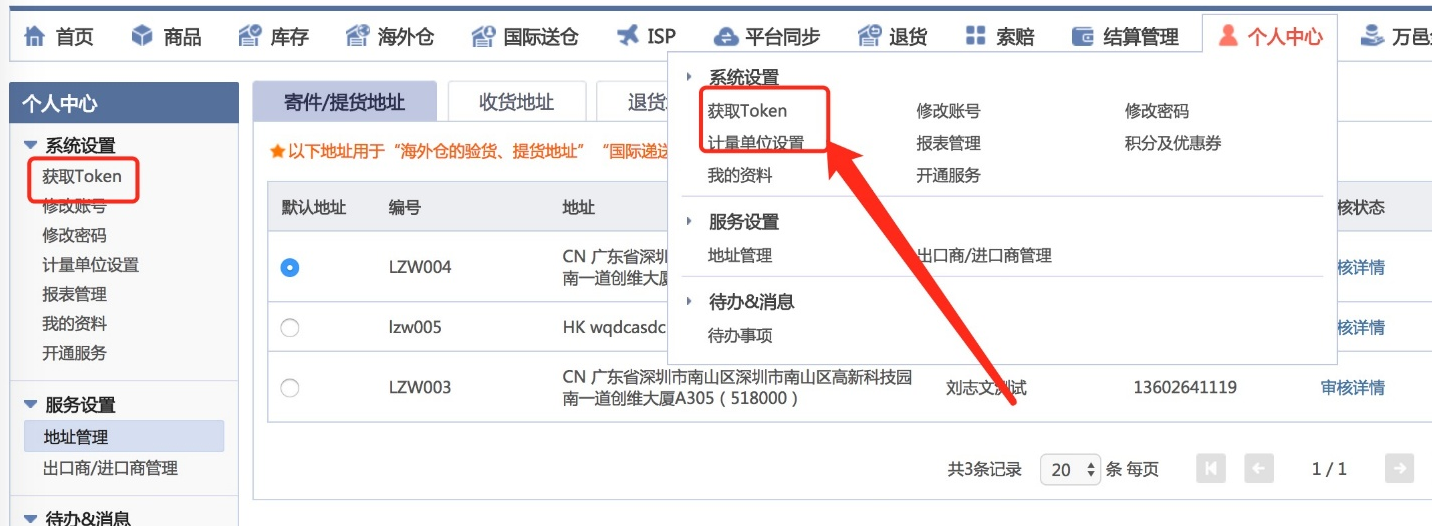 Step2:进入【个人中心】->【地址管理】->【穿件/提货地址】点击新增地址,填写地址详细信息后,点击【提交】创建地址【编号】。